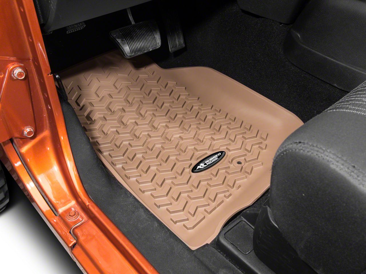 Construction. Rugged Ridge's tan front floor liners are high pressure injection molded out of durable thermoplastic, a process that can be used to create high edges and deep channels. The bottom of each liner is covered with raised nibs which grip the carpet and prevent sliding or movement. Each pair is precision engineered to sync with the contours of the specific vehicle they are to be used with.