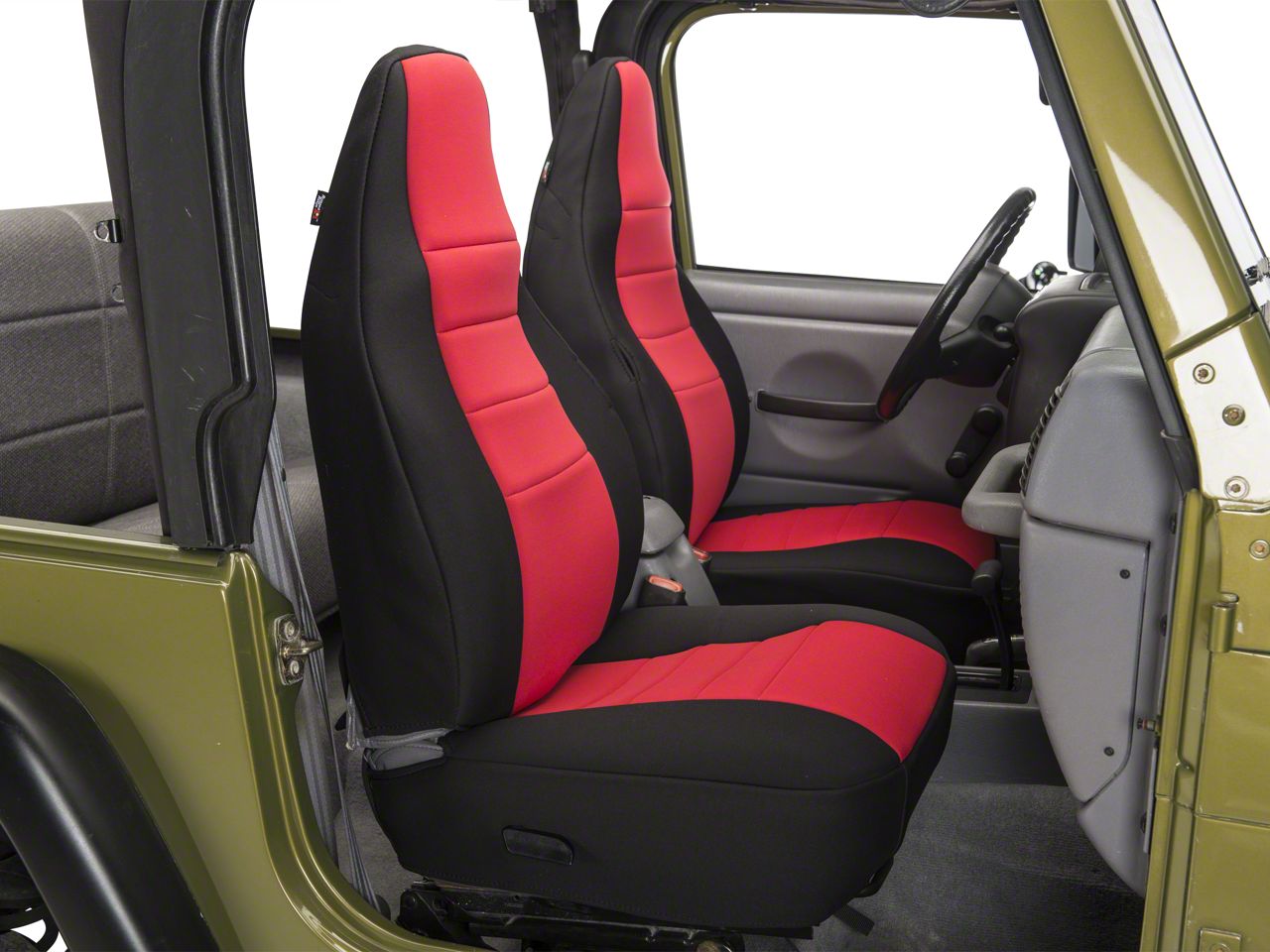 Key Features. Don't just protect your Jeep's seats, do it in style with these red Neoprene Front Seat Covers. They boost the customized feel of your rig, becasue each one is tailored to fit the contours of your stock front seats absolutely perfectly. In fact, the result could fool people into thinking you had the seats reupholstered, because the covers don't sag or bunch up anywhere. Attachment cords and hooks are hidden on the underside of the seat, preserving the clean look. The cover material is water resistant and doesn't heat up a bunch in direct sunlight, plus holds up under heavy use, making it perfect for playing in the great outdoors.