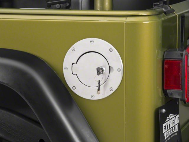 Construction. This brushed aluminum gas cap cover from Rugged Ridge is treated to resist harsh chemicals to provide a smooth, and clean appearance for years.