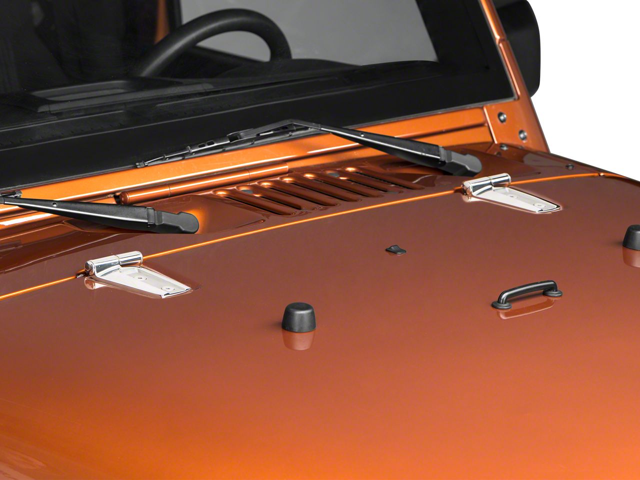 Specs. Sleek yet tough-looking, Rugged Ridge's Stainless Steel Hood Hinge Kit is made to replace the factory hood hinges on your JK Wrangler in the easiest way possible. These handsome, rust-proof components have smooth surfaces with a silvery, mirrored finish. The designs are sturdy and rugged, able to stand up to years of use and weather while shrugging off corrosion. Get a functional and aesthetic upgrade today with these high quality hinges from one of the most famous and reliable names in aftermarket Jeep parts.