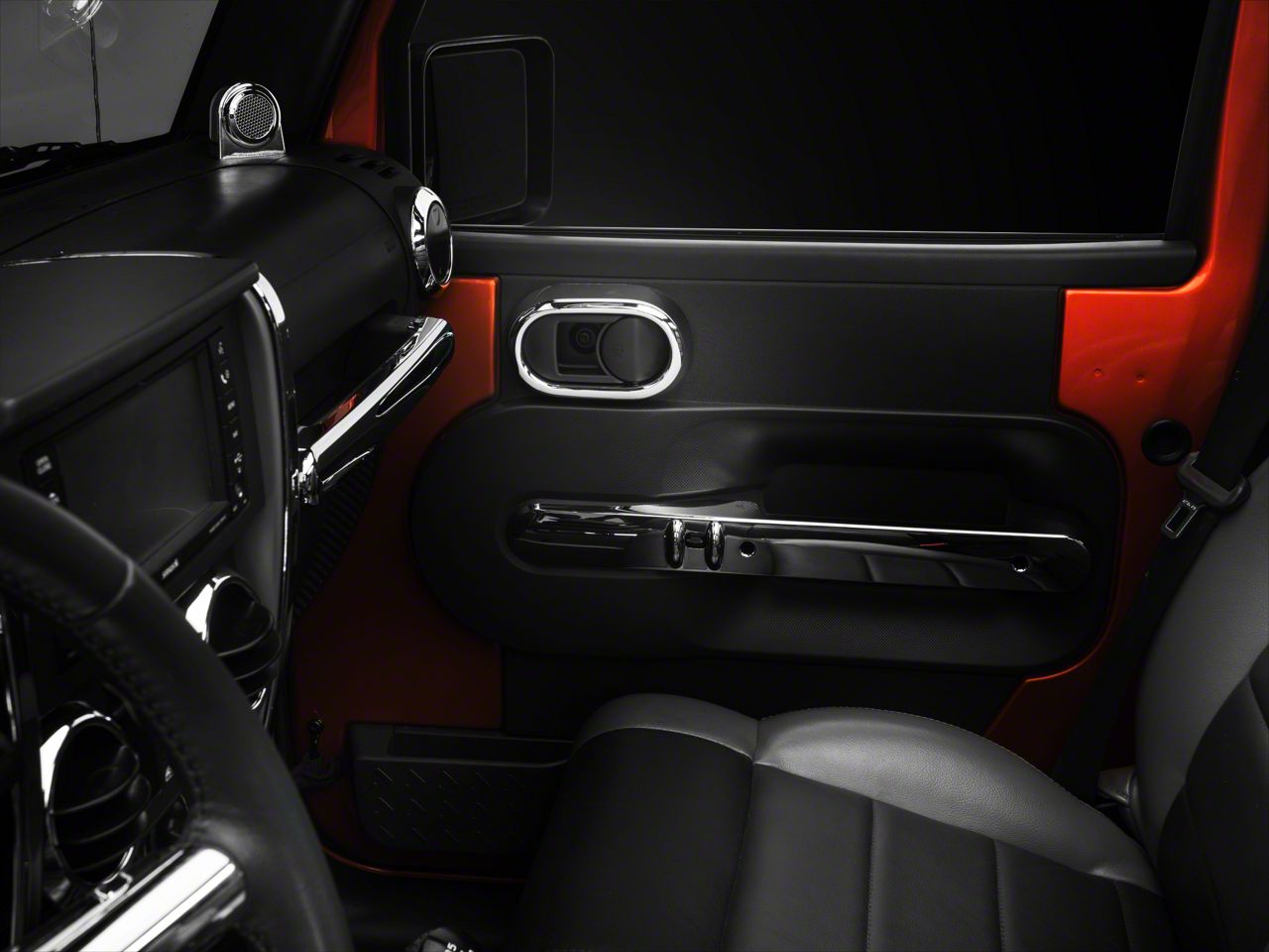 Classy Interior Accents. Give your Wrangler JK’s interior a classy new look with these Rugged Ridge Door Handle Trim; Interior; Chrome. These trim accents feature a chrome finish and are designed to fit the outer surface of your interior door handles, perfectly adding a classy styling cue. This design also allows these trim accents to conceal any minor scratches or dings on your handles, eliminating the need for replacement.