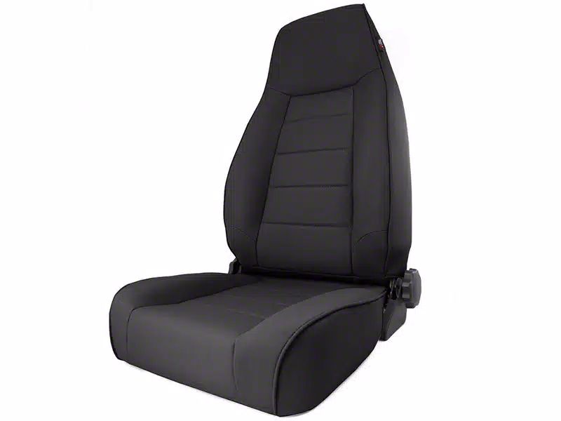 Top Quality Structure. The Rugged Ridge High-Back Reclining Front Seat is crafted with automotive-grade vinyl, ensuring durability and easy maintenance. The dense foam and heavy-duty raised springs provide superior comfort and support, making long drives more enjoyable. With its black denim finish, this seat adds a touch of style to your vehicle's interior. Not only is it stylish, but it is also resistant to wear and tear, ensuring it withstands the rigors of daily use.