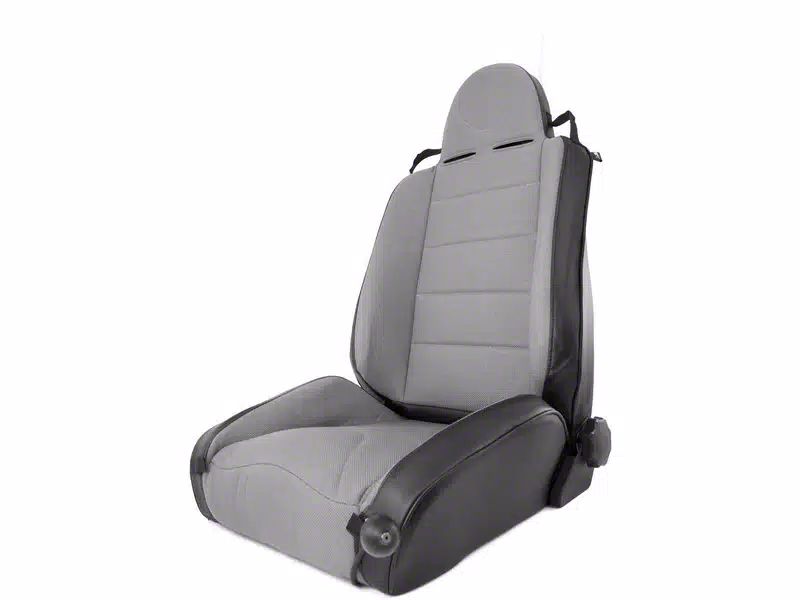Comfortable Racing. Made for the Jeep Cherokee XJ, this Rugged Ridge XHD Off-Road Racing Seat comes in a matte black and light grey finish. Crafted from ultra-dense foam with steel supports, this front reclining seat model is equipped with side bolsters for lifted jeeps and has a special ball pump for adjustable lumbar support.