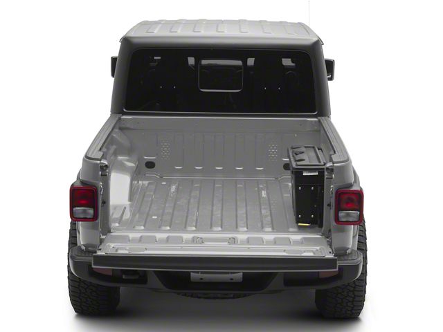 Keeps Your Valuables Safe. Maximize the unused areas of your truck bed by adding this Rugged Ridge Armis Swing Case Storage; Passenger Side. This compact storage box is perfect for your recovery gears, tools, and various travel items. It is fittingly configured to neatly stow inside the truck bed against the wheel well and can be easily accessed by means of the release lever. Moreover, you can conveniently access this storage case from the tailgate area without reaching over or climbing into your truck bed.