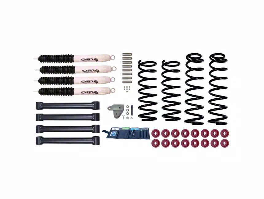Quality Parts. Constructed from quality parts, this kit has ductile iron coil springs, neoprene-wrapped grab handles, ORV shocks, and red plastic bushings.
