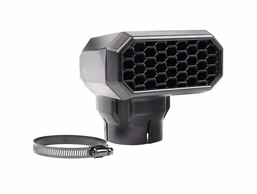 Seamless Compatibility. This AmFib Snorkel Ram Inlet is designed for a bolt-on installation with no cutting required. It is seamlessly compatible with your High-Mount AmFib System and comes with a durable, 3-inch clamp for a secure and stable attachment.