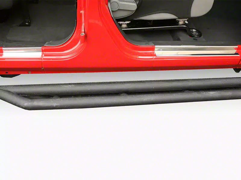 Description. Protect your door threshold with these stylish entry guards. Available in three different finishes, black, polished stainless, and aluminum to enhance the look of your Jeep while providing the ultimate in protection. 2007-2013 Wrangler entry guards available for 2 and 4-Door models (2-door kits will fit front 4-door applications) 07-13 Wrangler models attach without screws using durable double sided automotive grade adhesive.