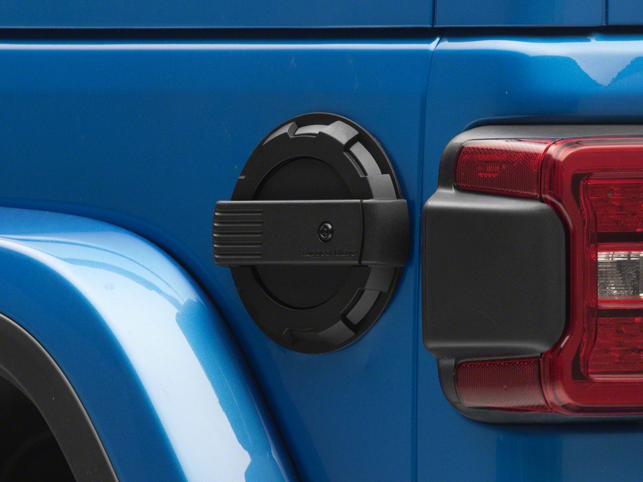 Premium Fuel Door. The Rugged Ridge Elite Locking Fuel Door; Black is designed to replace the factory fuel filler housing with a durable, locking alternative that enhances vehicle security and style. It offers refined mechanical operation with a positive retention latch and hidden internal hinge, ensuring ease of use and theft prevention.