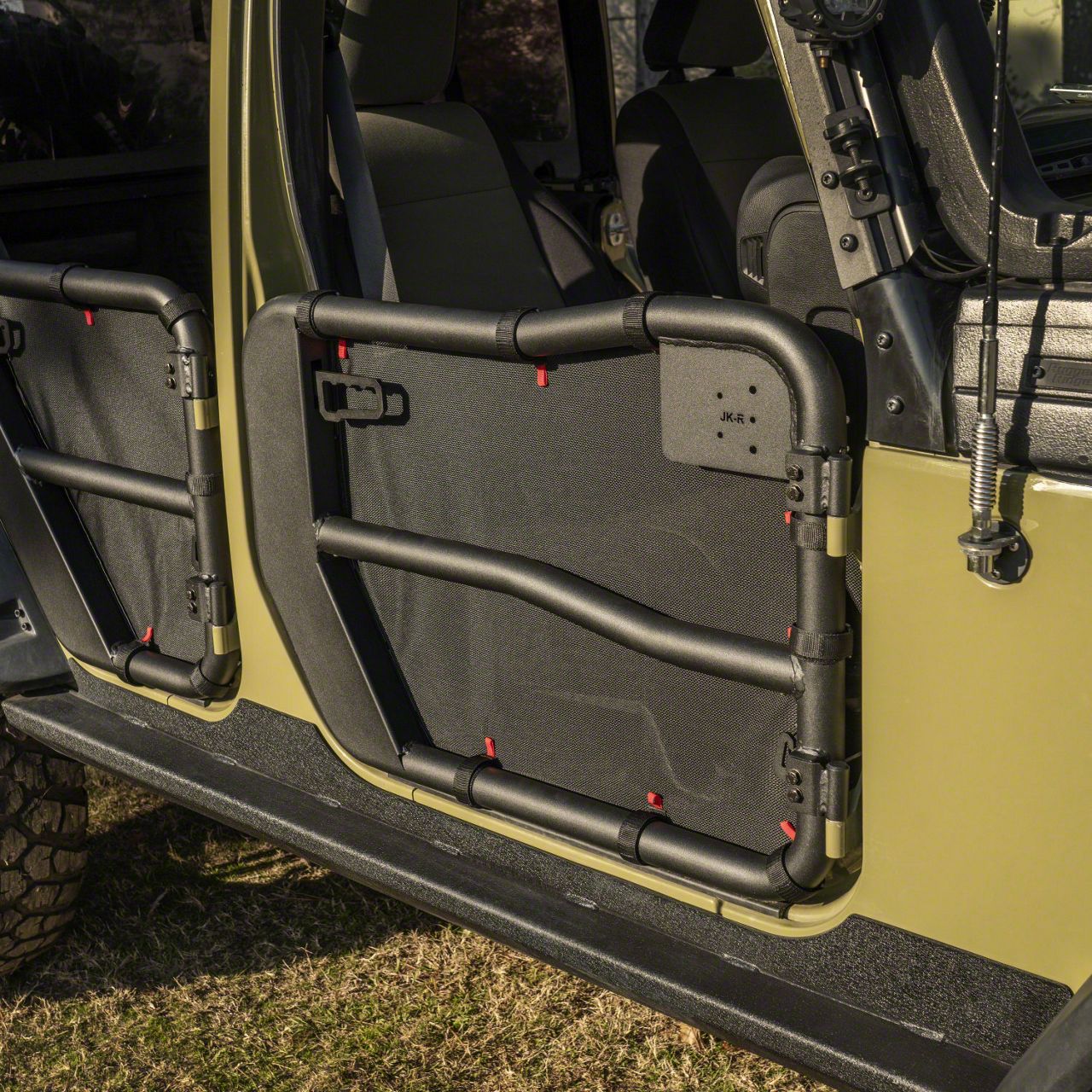 Off-Road Accessory Worth Having. If your Jeep Wrangler JK regularly sport off-road tubular doors, you need these Rugged Ridge Fortis Front and Rear Tube Door Covers for added reinforcement. These off-road mesh door covers provide essential coverage when the sun gets too hot, the wind gets too gusty, or rain starts to fall. With these covers on your doors, you and your passengers will get to enjoy a more pleasurable driving experience off-road or on it.
