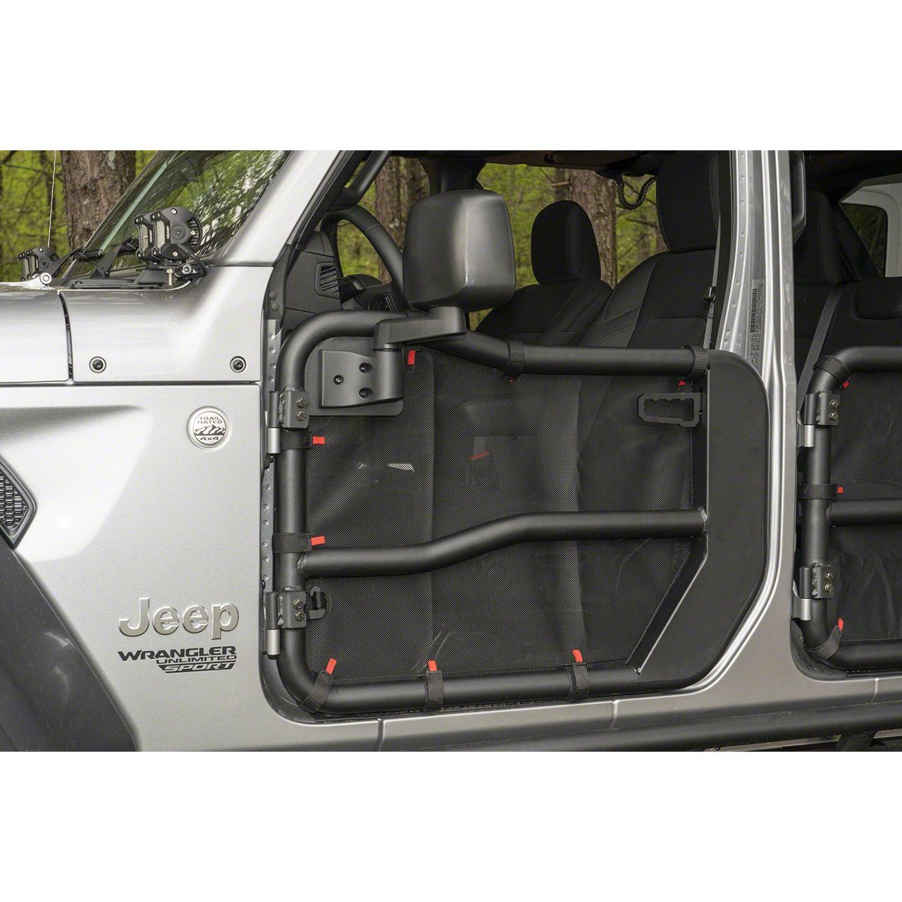 Highly Functional Design. These rugged black front tube door covers inject a new level of personality for your Jeep Wrangler JL, comprising of a nylon reinforced mesh construction and firm placement using integrated retaining straps fit for all weather conditions.