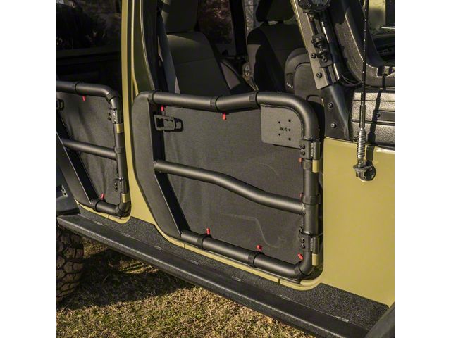Application. These Rugged Ridge Fortis Front Tube Door Covers in Black fit all 2007 to 2018 Jeep Wrangler JK models.