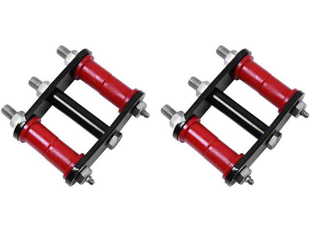 Red Bushings. Outfitted with red bushings, this shackle kit not only adds a bold visual element to your Jeep but also offers enhanced durability. The bushings are designed to withstand the rigors of off-road driving, providing long-lasting performance and improved suspension articulation.