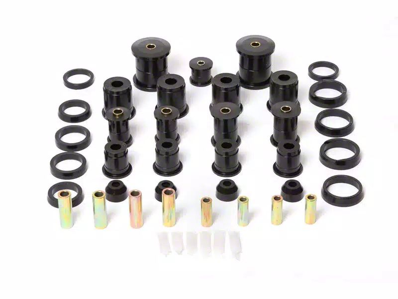 Description. This red total bushing kit includes all of the bushings you can replace on your Jeep and once installed provides better handling and control of your Wrangler. They are made of polyurethane which is a stronger replacement than rubber and lasts for as long as you need it!