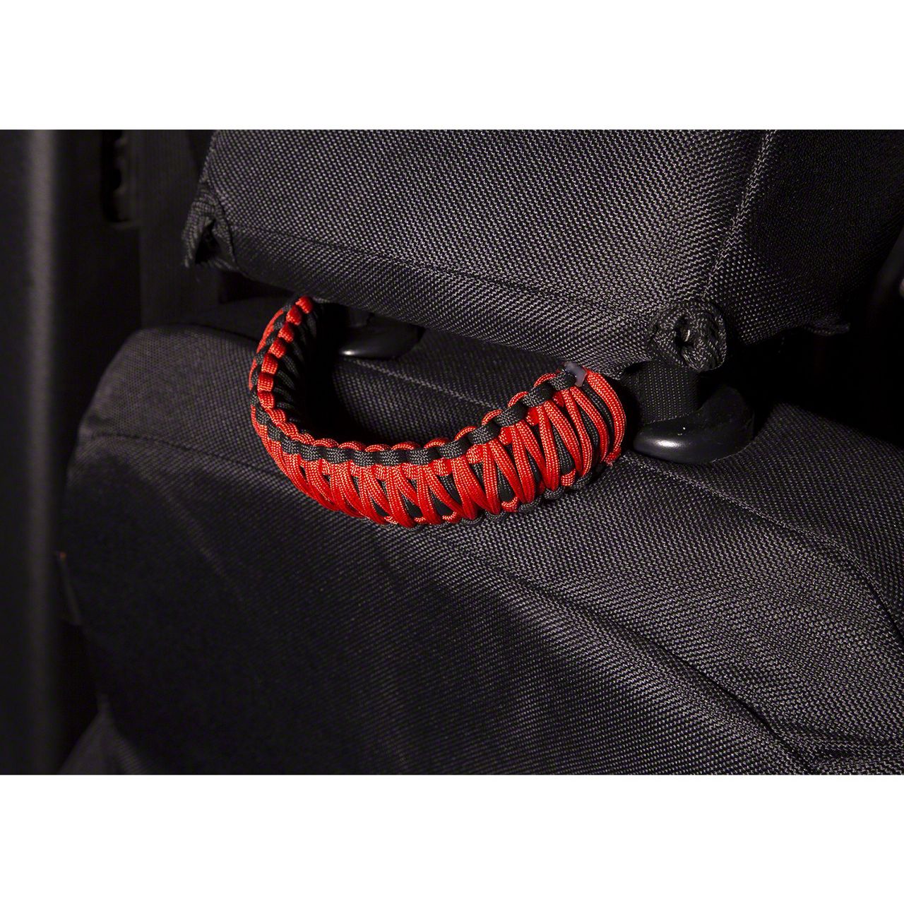 Handy Accessories. Provide your back passengers a stable handhold during rough and tumble off-road adventures with these Rugged Ridge Seat Mount Grab Handles in Red. These functional and stylish accessories look awesome with their braided nylon parachute cords providing a bright red pop of color inside your Jeep. More importantly, they help your passengers remain steady, even as you drive through the wildest terrains.
