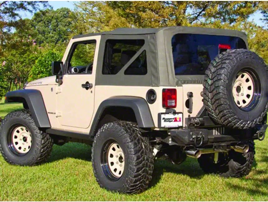 Construction and Appearance. Constructed from sailcloth-quality premium vinyl-coated polyester, the Rugged Ridge XHD Soft Top comes in a stylish khaki color that compliments your Wrangler JK's off-road look. This soft top has a marine-grade threading for added resilience and is UV-treated to prevent fading and premature wear. Moreover, the 30 mil tinted or non-tinted glass windows are DOT-approved.