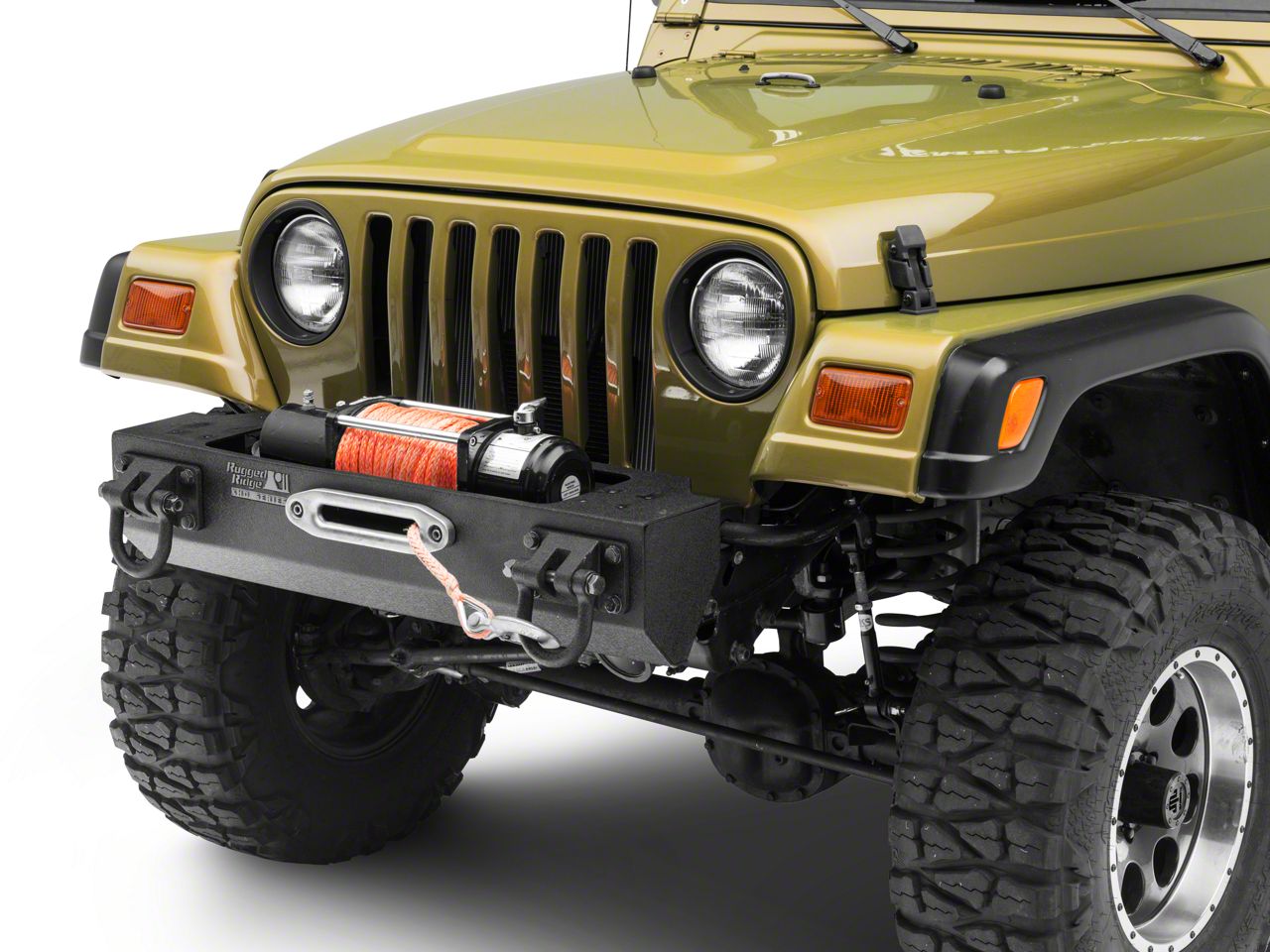Function. This Jeep Wrangler front bumper features an eight bolt frame mount design that ensures sturdy attachment to the vehicle. Its two overbuilt pull points allow you to mount the included D-rings and stinger. With narrow overall width, this bumper provides high clearance for the front tires. Its side filler plates perfectly seal the ends for a complete look.
