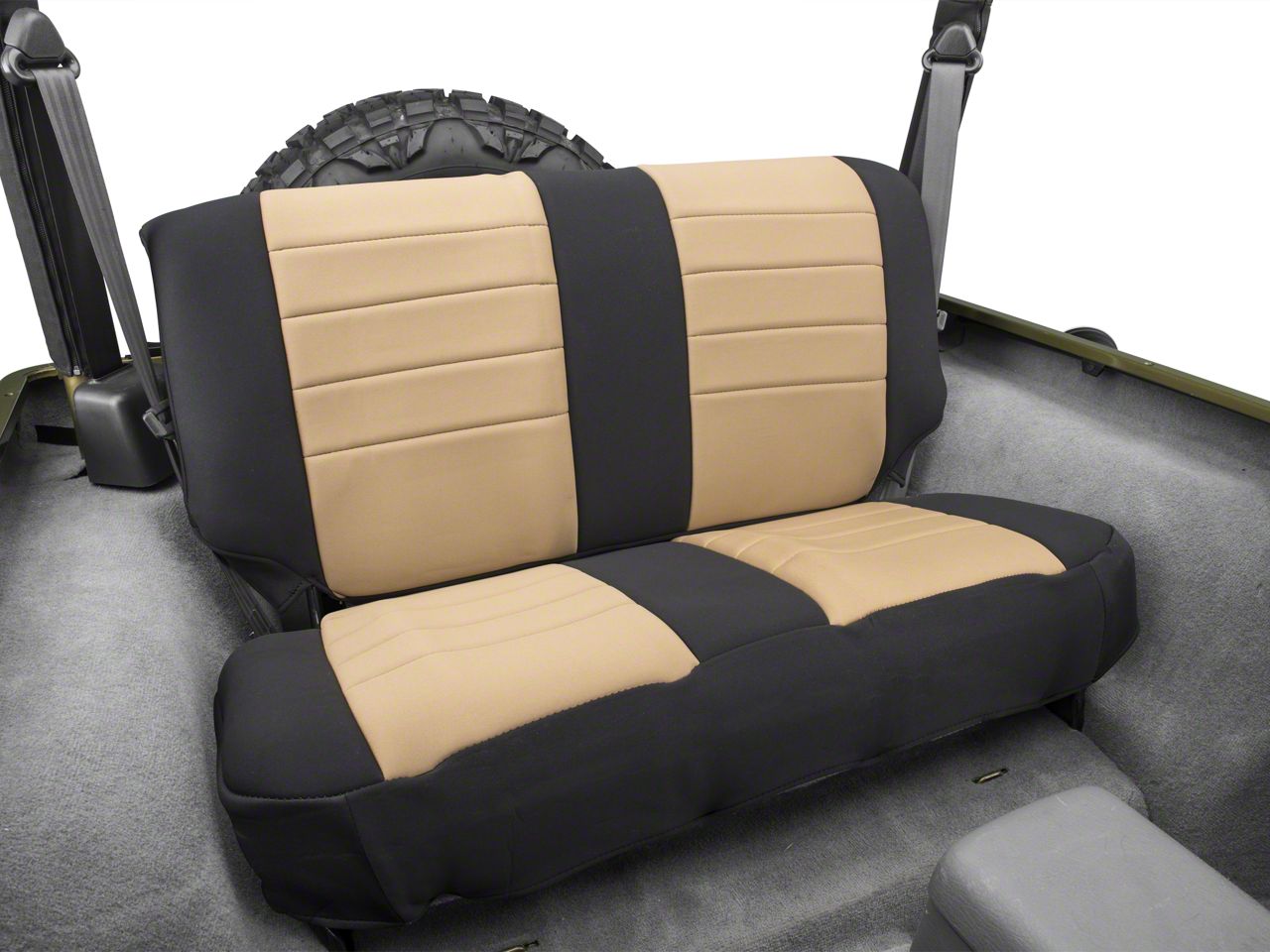 Application. These Neoprene Rear Seat Cover; Black/Tan fits 1997-2002 Jeep Wrangler TJs.