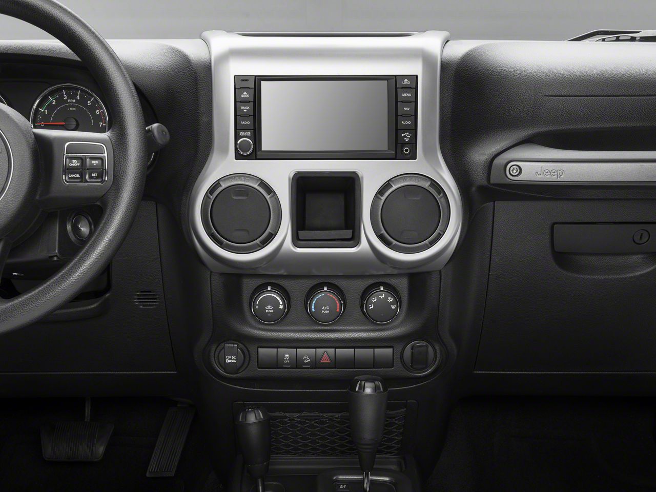 Key Features. Make the interior of your Jeep feel fuller and more luxurious with this Center Radio Console. The brushed silver finish definitely adds an air of sophistication without being over the top. It also helps your vehicle stand out and have a custom appearance. Not only does the trim piece liven things up, it's made to fit like part of the stock setup, without any messy gaps or other fttment issues. It wipes clean easily, just like everything else on the dash and will withstand direct sunlight and even exposure to rain. Double-sided installation tape is included.