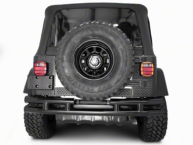 Function. This jeep rear bumper has a large opening at the rear end to let the tire mount accommodate larger spare tires of up to 31 inches. It features a UV-treated textured plastic filler plate that occupies the space between the vehicle's body and bumper.
