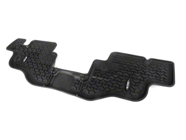 Construction. The Rugged Ridge rear floor liner is injection molded out of a tough, high quality thermoplastic material. The injection molding process makes high relief features possible, unlike the much more common vacuum forming. The liner is very durable, as shown by the limited lifetime warranty. The surface features chevron-shaped moldings that make up Rugged Ridge's proprietary Deep Tread technology.
