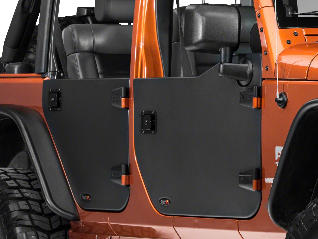 Specs. Let in those refreshing summer breezes with Rugged Ridge's Rear Half Door Pair for modern 4-door Wranglers. The exterior skin in which the door is wrapped is made of impact-resistant black ABS thermoplastic, which is smooth and paintable on the exterior and textured to match the overall upholstery on the inner side. This tough plastic is wrapped around a reinforced, powder-coated steel frame for strength.