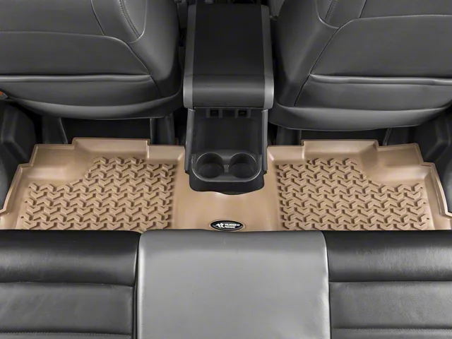 Construction. The Rugged Ridge rear floor liner is made out of tough, extremely durable tan thermoplastic for years of use. High pressure injection molding allows high edges and deep channels in the proprietary Deep Tread technology. Molded nibs on the reverse provide good grip on the carpeting. The opening for the floor hook attachment is self-healing, closing around the hook to prevent leakage.