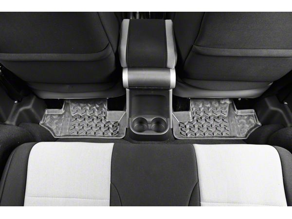Specs. Designed for 2 door models of the 2007-2018 Jeep Wrangler JK, these rear floor liners are made to flank the center console while offering peak protection to the carpets and shielding the floorboards from rust. The chevron treads and the channels between act to trap water, grime, mud, and snow, keeping it from flowing onto the carpets or soaking into occupants' shoes or boots. The raised perimeter walls offer further protection to the Wrangler's floor. The thermoplastic resists wear and lasts for many years and many adventures. The company provides a lifetime limited warranty.
