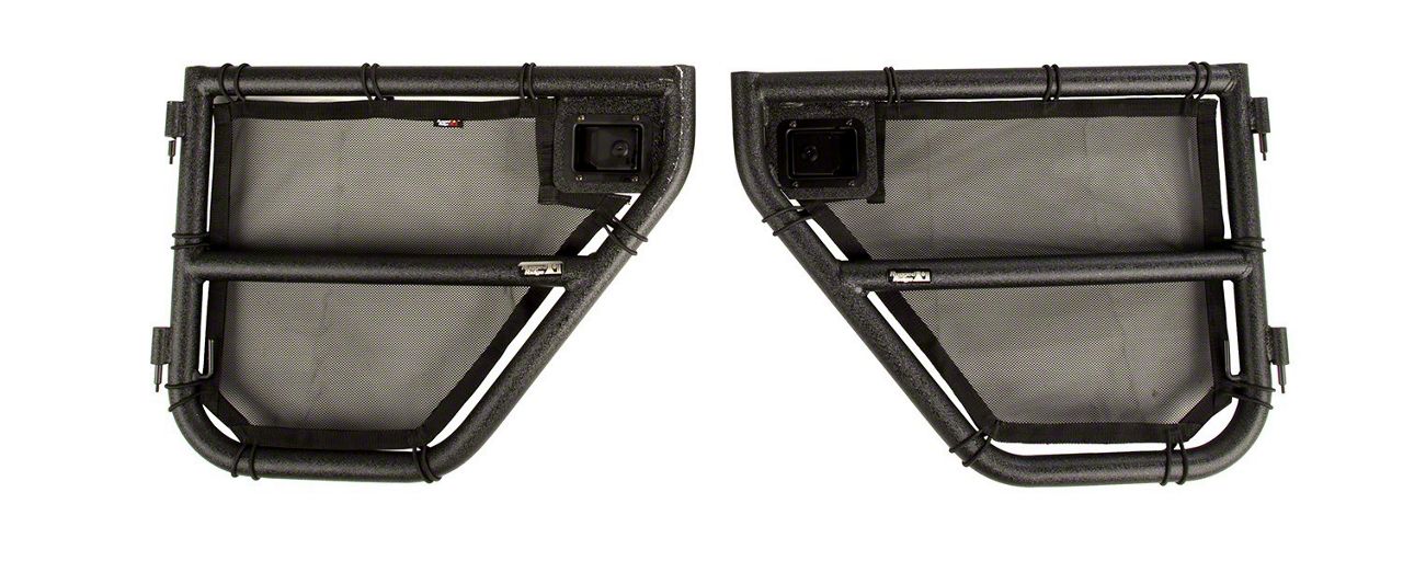 Secure, Open-Air Experience. The Rugged Ridge Rear Tube Doors perfectly combine the open-air atmosphere without compromising the passenger’s safety. The tube doors’ durable construction provides reliable security and the semi-open structure provides more visibility of the rugged terrain for added ride excitement.