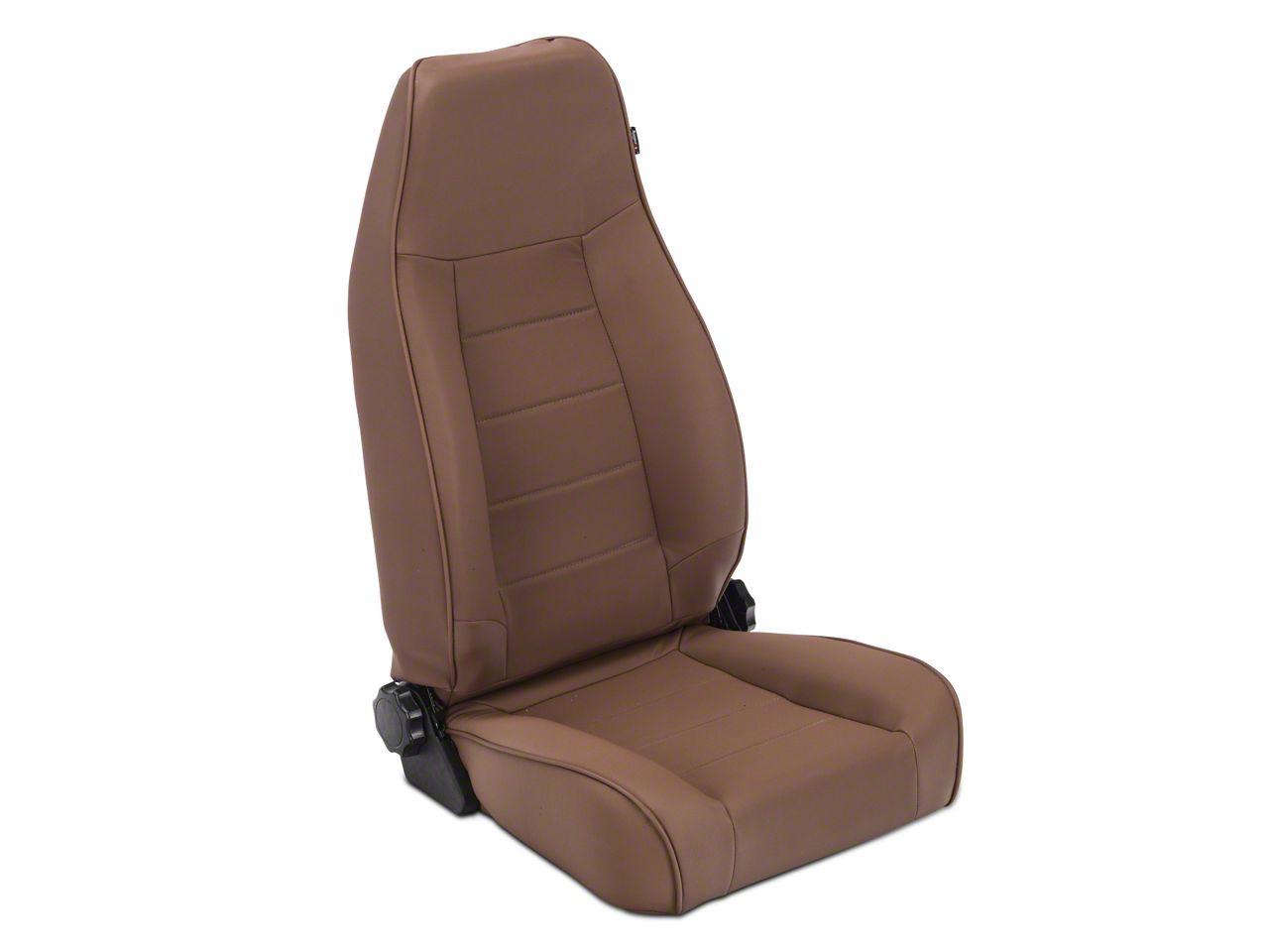 Function. Rugged Ridge manufactures this sturdy yet comfortable front Jeep seat with a corrosion resistant powder coated steel frame that withstands years of use. The seat includes nutmeg colored vinyl upholstery of a tough, smooth automotive grade, plus spring suspension and dense foam padding for comfort and support. The seat's headrest is integrated.