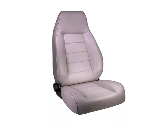 Function. Gray automotive grade vinyl upholstery closely matches this front seat to the original, and OE seatbelts are compatible for safety and convenience. Featuring a reclining configuration, this Rugged Ridge seat fits either front position due to a dual recline mechanism. Interior details include a powder coated steel frame and spring suspension.