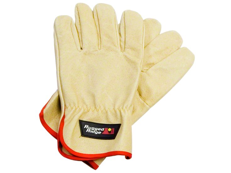 Capacity. Rugged Ridge's protective leather gloves keeps your hands safe from nasty wire cable gouges while using your winch. The gloves sport a great looking natural leather color with Rugged Ridge's logo and orange seams.