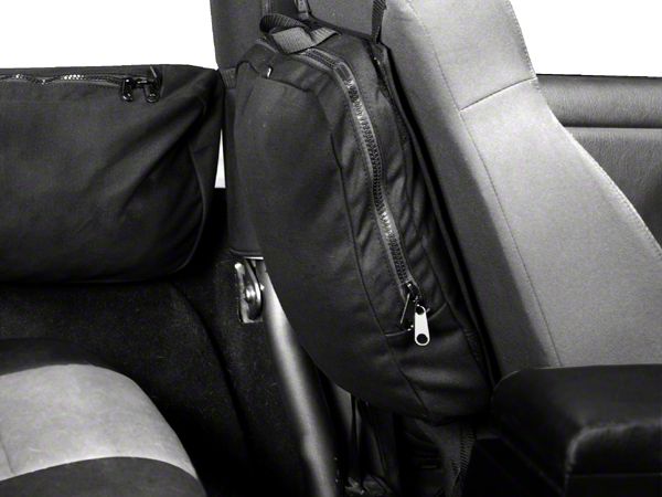 Storage Benefits. A fabric panel attaches the trail bag right to your Jeep's seat back with heavy-duty nylon straps. The bag then attaches to this panel with Velcro, providing you with an easy installation process, while the fabric base and straps remain on the seat back. The bag works with both hard tops and soft tops and last but not least is backed by a 5 year warranty for your added coverage.