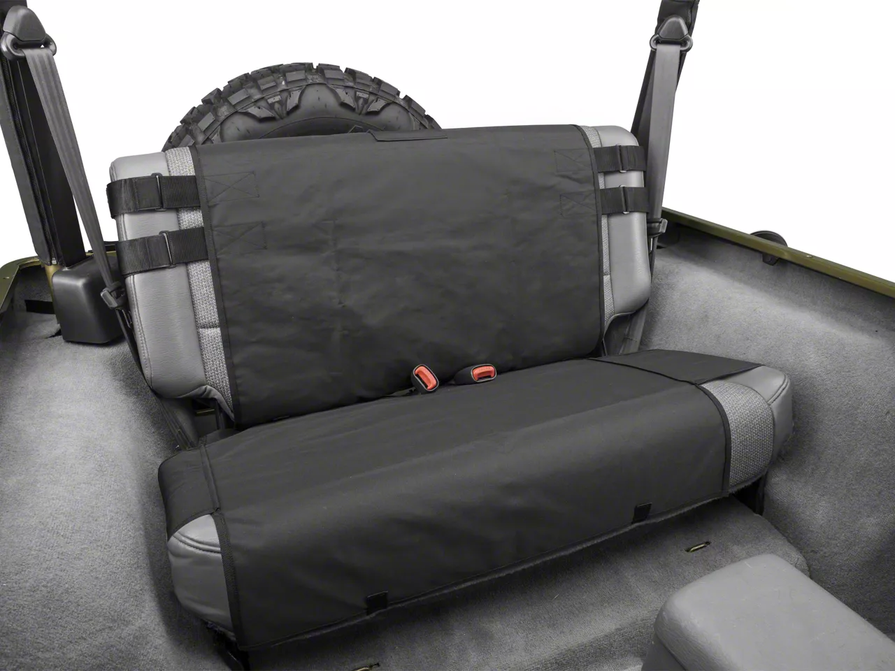 Specs. Made out of sleek black fabric, the Rugged Ridge Black Rear Cargo Seat Cover is a great way to protect your seats (or perk them up if they are already worn) and get some extra storage space at the same time. These seat covers are made out of thick, effective 600 denier polyester with a waterproof PVC liner. Capturing water and dirt and keeping the seats somewhat cooler than vinyl even in hot, sunny meteorological conditions, this seat cover also adds some storage space in the form of a MOLLE/PALS system and a set of handy pouches to go with it.