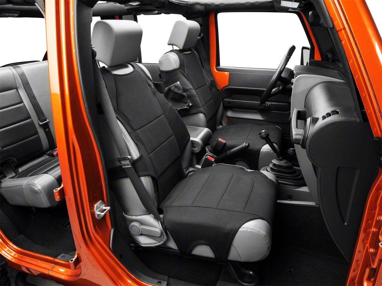 Properties. These seat covers install easily and instantly with included elastic straps and hooks. They come in a sleek and stylish black color to go with your jeep's interior.