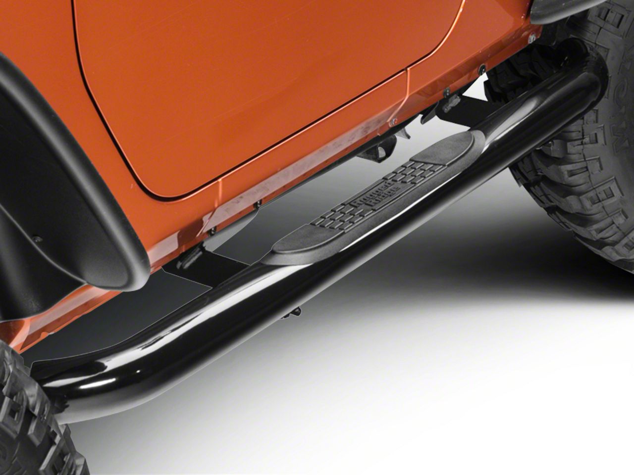 Sturdy Construction. Rugged Ridge Shiny Black Side Steps provide a convenient support to step in or out of your jeep. They feature a durable, stainless steel tubing to ensure reliable performance. Featuring classic styling, these side steps include no-slip nylon pads. These UV-treated nylon pads provide a firm grip for maximum support. Rugged Ridge tube steps have welded metal end caps for a clean look. With no drilling required, they are easy to install.