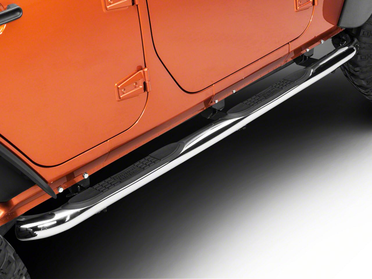 Crisp-Looking and Effective Nerf Bar Steps. Giving a bright, clean look to the rocker area of your 4-door 2007-2018 Wrangler, the Rugged Ridge Polished Round Side Step Bars also puts four no-slip step pads right underneath your vehicle’s doors. These tough, high traction nylon pads give you the means to hop in easily even with a lifted suspension, bad footing on uneven ground, or tiredness after a day of exciting wheeling. Made from generously sized 3” diameter stainless tubing, the steps also help armor up your rocker panels and lower doors against potential dings and dents. The steps won't bounce around since they bolt onto the frame with 3/16” plate steel brackets.