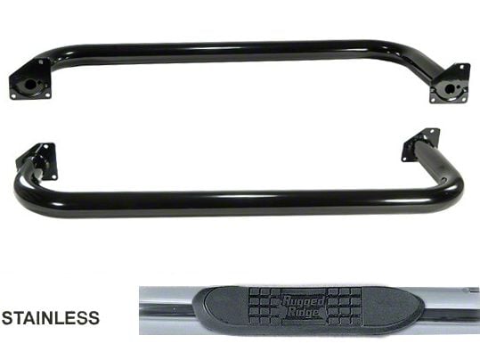 Strong Stainless Steel Step Bars. Pep up your YJ generation Jeep's looks – and add some extra functionality to your classic 1987-1995 Wrangler – with the Rugged Ridge 3-inch Stainless Steel Round Side Steps, fitted with non-slip nylon step pads bearing the Rugged Ridge logo. The polished stainless steel looks clean and cheerful on your vehicle, and, since it’s T304 grade, won’t rust or discolor. These bars provide medium protection to your Jeep’s lower surfaces (doors, rocker panels, etc.). Their firm attachment to the frame means they won’t wiggle unpleasantly under your foot when climbing into or disembarking from your Wrangler.