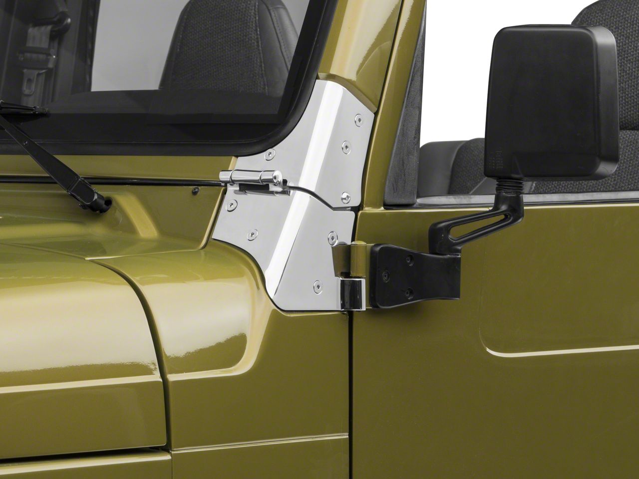 Specs. Rugged Ridge's pair of windshield hinges enhance your Jeep's style and give your rig a look you can be proud of. Made using high quality 304 stainless steel and featuring a polished finish, this set will stand up to the abuse of on-road or off-road driving.