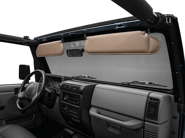 Design. This Rugged Ridge sun visor set is covered in easy-to-clean camel colored vinyl, and is designed to exactly match the factory installed visors. An adjustable rod is built into the visors, which allows drivers to move and modify them as they drive. These are the top choice of those with damaged, worn, or faded visors, or those who want to restore their Jeep Wrangler to the original design.