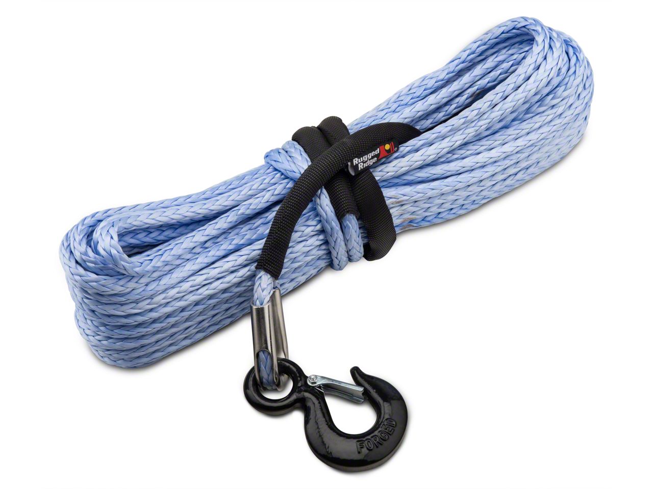 Specs. This 94 foot long, 3/8 inch thick synthetic winch rope made by Rugged Ridge is crafted from 12 strands of Dyneema SK-75 fiber and has a forged latched hook that has been powder coated to prevent corrosion. Dyneema fiber is fungal resistant, and very resistant against chemicals including; jet fuel, hydraulic fluid, oil, solvents, de-icing fluid, and many more.