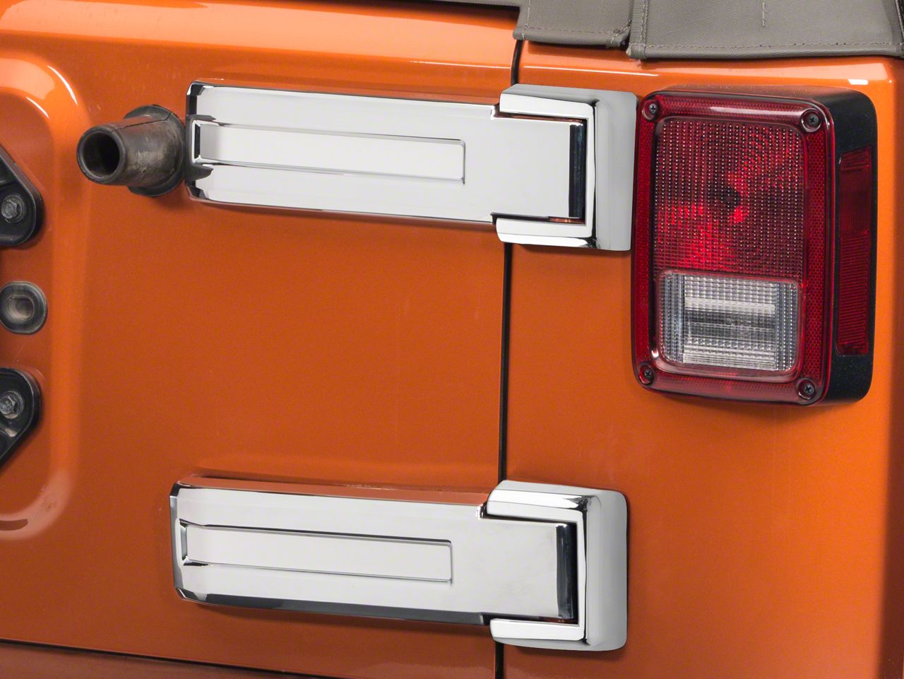 Specs. Pepping up the look of your JK Wrangler's tailgate hinges is easy with Rugged Ridge's Chromed Tailgate Hinge Covers. These plastic, chrome-plated covers attach quickly to give your hinges a flashy new look that looks particularly striking in sunlight. They also help protect the hinges.