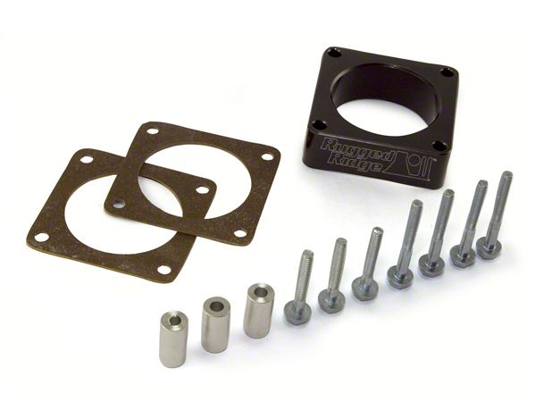 Specs. Getting dense, cold air into your engine lets your Wrangler take a deep breath, as it were, and increases its power and performance – or in other words, its torque and horsepower. The Throttle Body Spacer by Rugged Ridge boosts engine aspiration strongly by lifting the throttle body 1 inch above the intake manifold. Cold air flows in through the large bore spacer to boost your Jeep's power. What's more, the spacer is a snap to install with hand tools and no drilling.