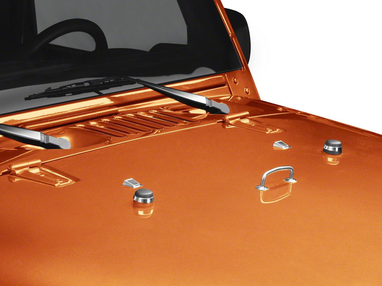 Specs. This hood tie down kit by Rugged Ridge includes a footman loop, a pair of windshield bumper covers, and a pair of wiper nozzle covers. These parts will give your hood a new look with the polished stainless steel while providing a great place to secure your windshield while folded down.