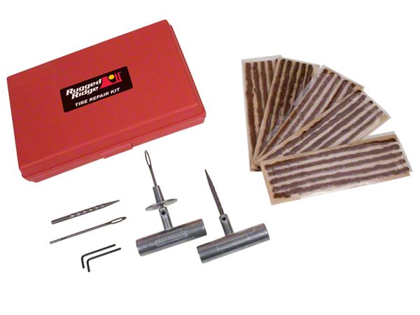 Specs. The tire repair kit by Rugged Ridge contains all the tools you need to repair a hole in your tire. This kit contains 2 reamers and 2 needles that are interchangeable to help you patch just about any tire. The interchangeable tool ends help keep this kit compact to save space in your vehicle by making it so you only have 2 handles instead of 4.