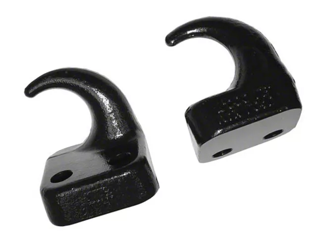 Specs. These tow hooks by rugged ridge are quality made and feature a black powder coating. They are designed to mount using the same holes your front bumper uses. This pair of tow hooks includes 4 longer bolts that replace the factory bolts that hold your bumper on.