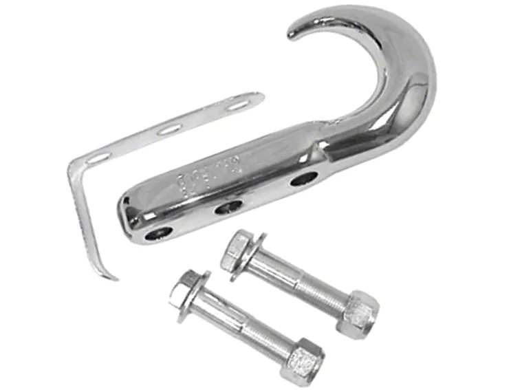 Specs. This front tow hook is made from strong, durable chrome and manufactured by Rugged Ridge. It mounts right to your Jeep's frame and is rated for up to 10,000 pound pulls.
