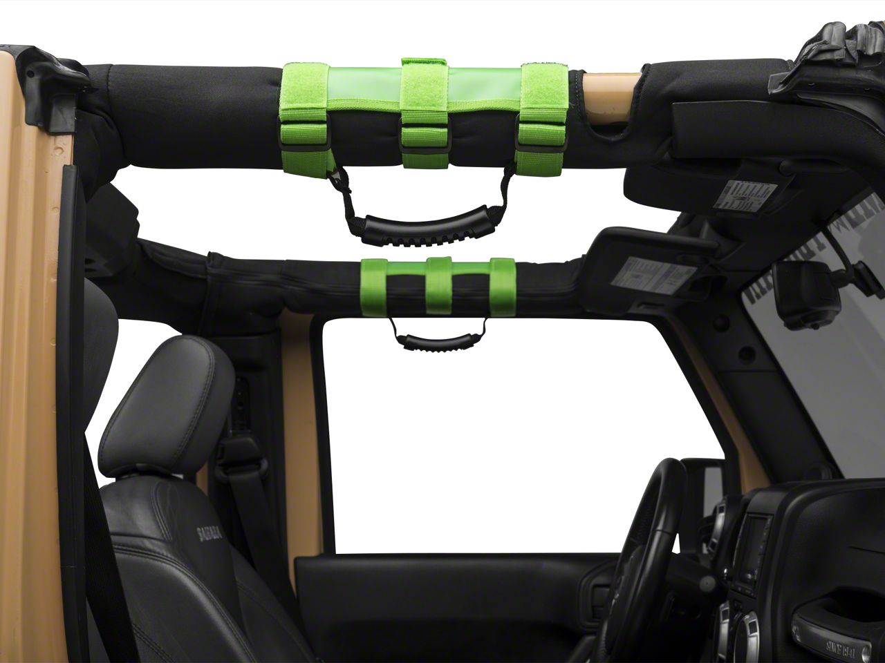 Great Look. A perfect addition to your Jeep's interior, these grab handles sport a green finish that provides an eye-catching accent as well as a heavy-duty off road look. While providing hardcore stability and safety in the toughest and most slippery weather, these handles will stay looking sleek and polished.