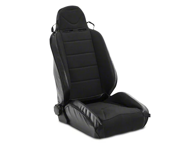 Properties. This seat is all about style and comfort. Though they may look similar to the original seat, you will appreciate the many updates to the design. The sport racing style has a unique seat belt harness cutout, and it includes an integrated headrest that can be expanded and adjusted up and down to get you the perfect neck support. Side bolsters give you even more comfort, and the infinite recline mechanism allows for total adjustment. The built-in lumbar support is a simple bulb you can pump to give you exactly the amount of lumbar support you are looking for.