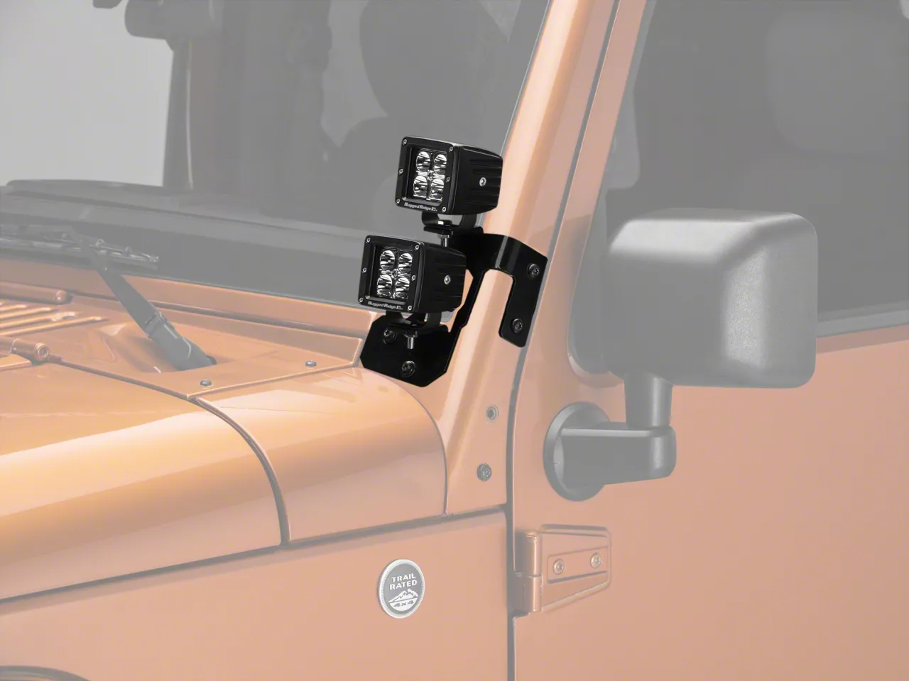 Lighting Upgrade. Take your Wrangler to a new level by upgrading with the Rugged Ridge A-Pillar Dual Light Mount Kit in Semi Gloss Black. This kit has everything you need to light up the trail, including four 3 inch square super bright LED lights and a pair of dual mount brackets. Simply bolt up, wire up your lights and roll out, with no extra fabrication to your Jeep or modding required.