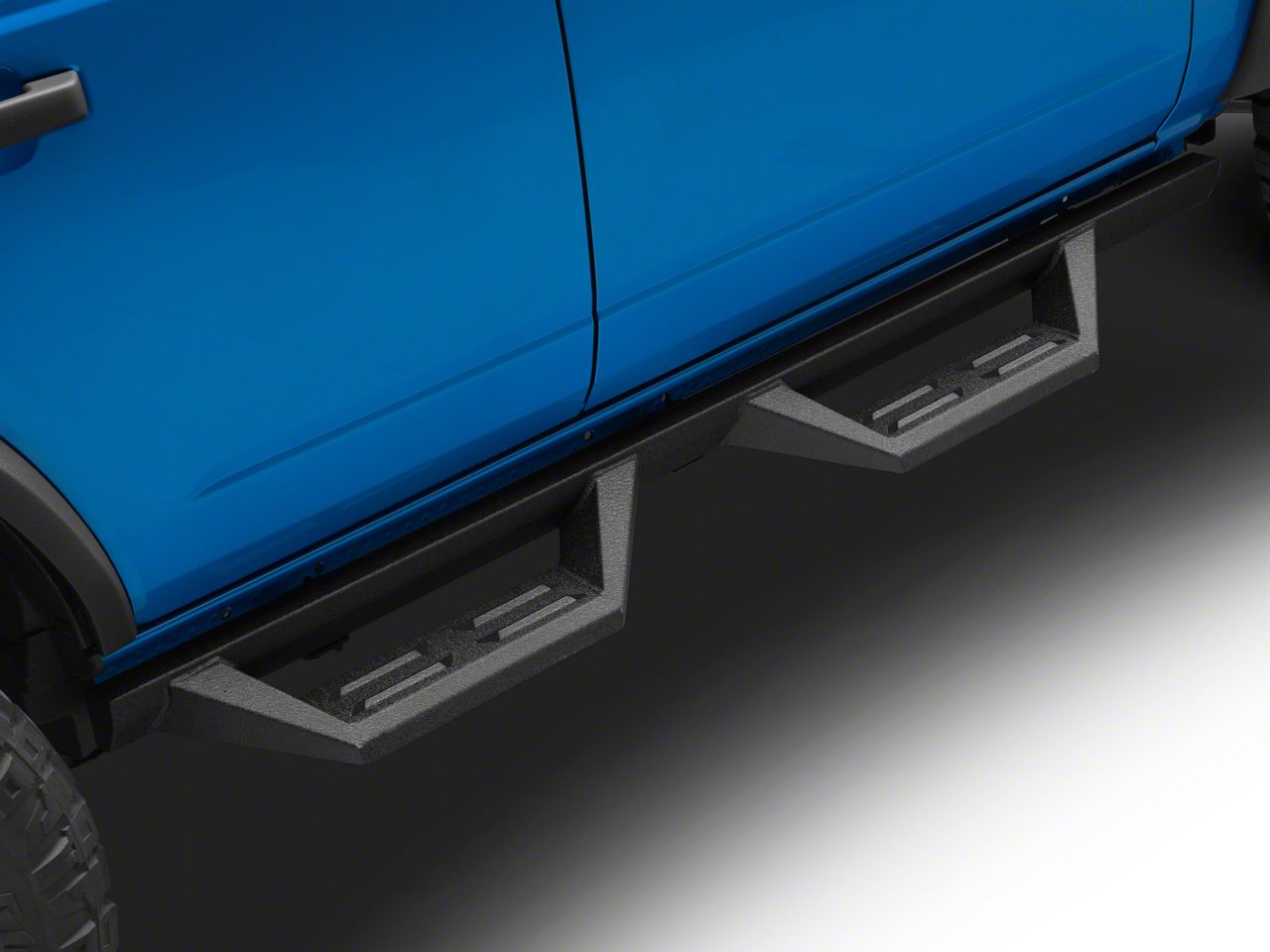Bold Robust Design. The RYNOSKIN Drop Side Step Bars feature a sleek and modern design that complements your Bronco's appearance, adding an aggressive and stylish look to your vehicle. They are also designed to fit perfectly with your Bronco's body, creating a seamless look that enhances your vehicle's overall style. Crafted from durable materials, these side step bars are built to withstand the toughest conditions and provide long-lasting performance for your vehicle. Their drop step design provides a comfortable and secure stepping surface, making it easy to enter and exit your Bronco.